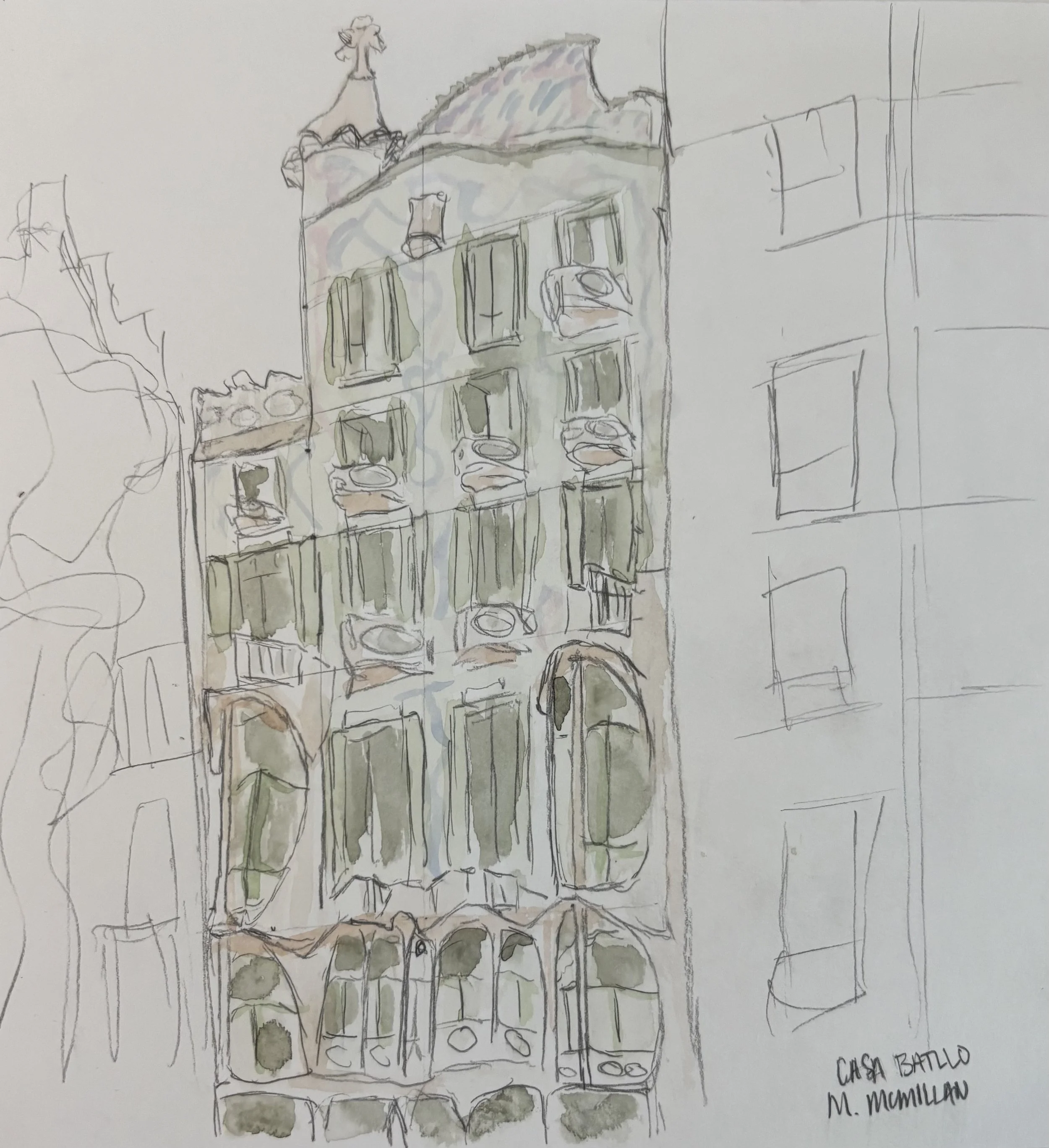 Casa Batlló. 2025. Watercolor and charcoal.